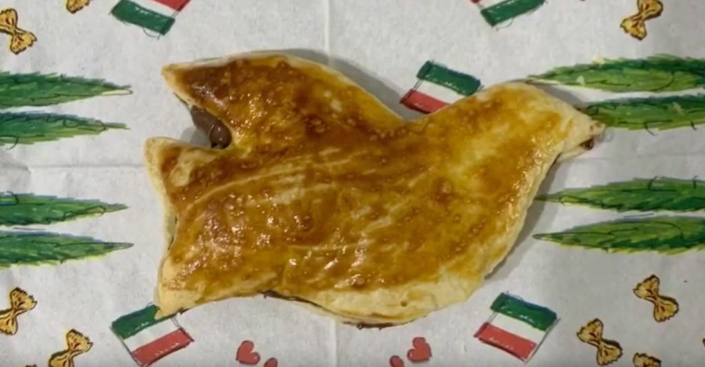 Prendete la sfoglia, infarinate bene il piano di lavoro e stendetela leggermente con un mattarello. Ritagliate su un cartoncino gli stampi a forma di colomba, coniglietto e uova. Una volta ritagliate le sagome sulla sfoglia, adagiatele su una leccarda foderata di carta forno e spennellatele con un uovo sbattuto con un cucchiaio di latte. Infornate in forno già caldo a 180 gradi per 20 minuti o a 160 gradi per 15 minuti se ventilato. Sfornatele e lasciatele raffreddare. Una volta fredde, tagliatele a metà e farcitele con la nutella. Chiudete con la metà superiore e spolverizzatele con lo zucchero a velo.