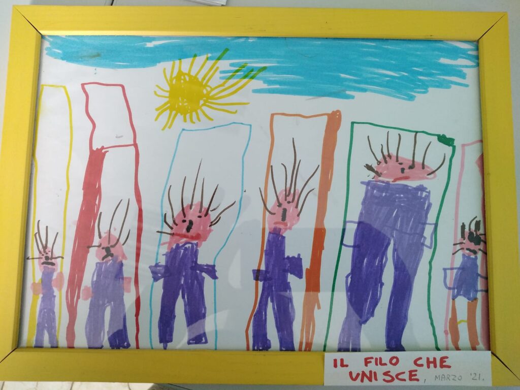 Vi chiediamo di costruire un di un piccolo quadretto con una cornice a piacere contenente un disegno libero fatto dal bambino con la scritta Il filo che unisce.