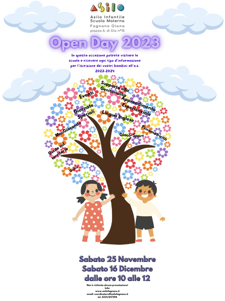 in occasione della prossima finestra d’iscrizione dei vostri figli al primo anno della Scuola dell’Infanzia, siamo lieti d’invitarvi ai nostri OPEN DAY che si terranno nei giorni di Sabato 25 Novembre 2023 e Sabato16 Dicembre, dalle ore 10.00 alle ore12.00, presso il nostro salone polifunzionale.